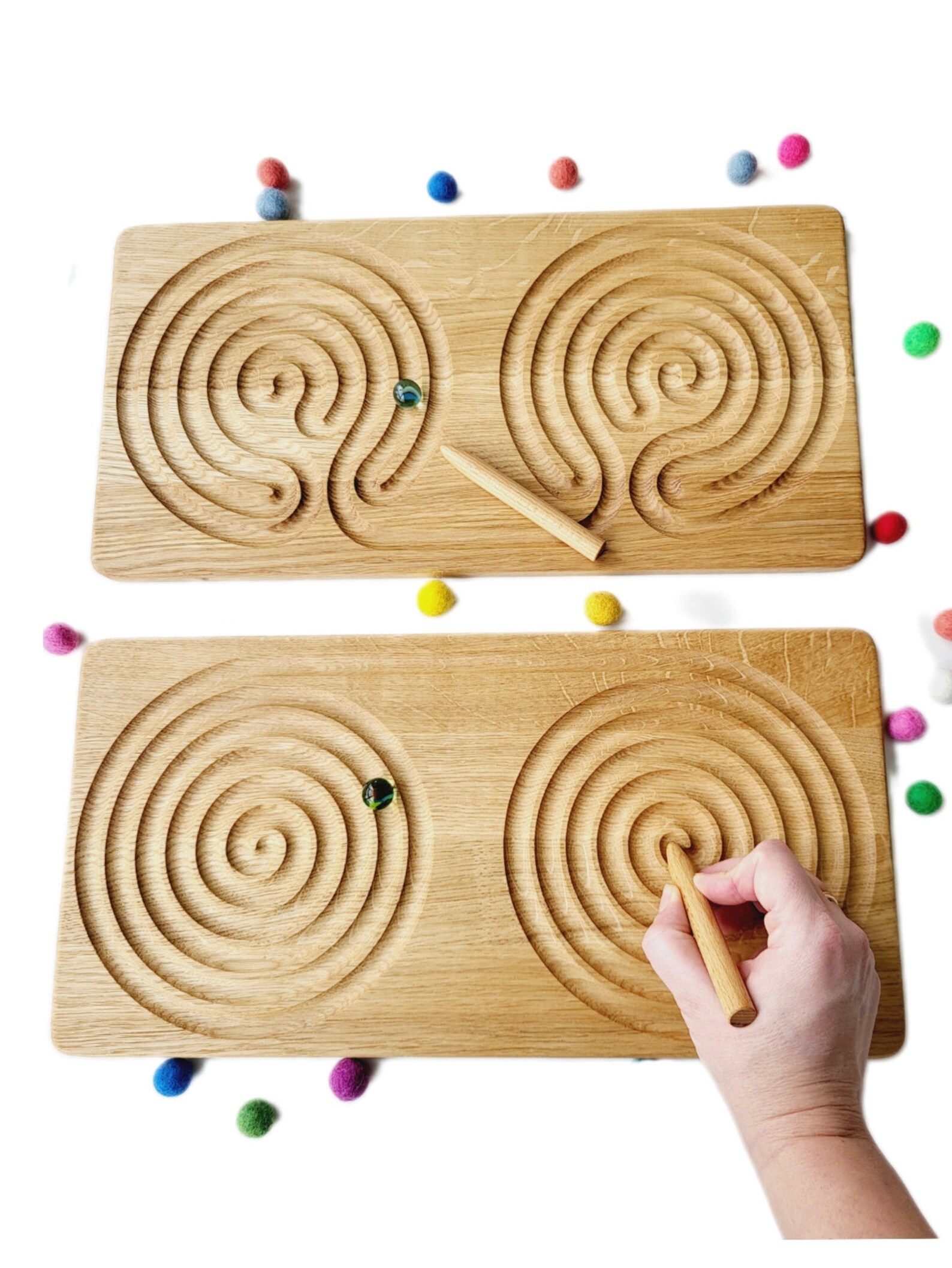 The Wooden Maze Game (Finger Maze) is a skill-based learning toy designed to improve focus, patience, and motor control through guided finger-tracing activities. As children move their fingers along the maze paths, they develop hand–eye coordination, fine motor skills, and concentration while learning to plan movements and solve simple challenges. This calming and engaging activity supports early skill development and is ideal for home learning, classrooms, and therapy settings.